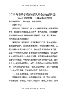 2026年春季学期新教师入职会议校长讲话:一年入门立根基,三年成长成良师.docx