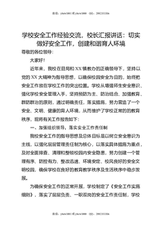 学校安全工作经验交流,校长汇报讲话:切实做好安全工作,创建和谐育人环境.docx