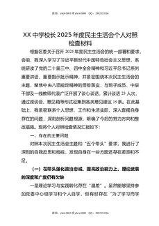 XX中学校长2025年度民主生活会个人对照检查材料.docx