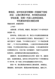 寒假后,初中校长新学期第一天国旗下简短讲话:让我们携手并进,共同担负起促进学校发展,培育一代新人的神圣使命,书写更加华丽壮美的诗章.doc