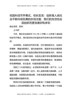 校园科技节开幕式,校长发言:创新是人类社会不断向前发展的永恒主题,我们的生活也会因创新而更加美好和多彩.docx