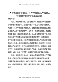 XX学校党委书记在2026年全面从严治党工作暨警示教育会议上的讲话.docx