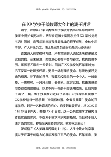 在XX学校干部教师大会上的离任讲话.docx
