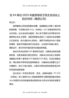 在XX单位2025年度领导班子民主生活会上的主持词(集团公司).docx