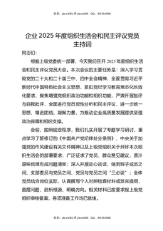 企业2025年度组织生活会和民主评议党员主持词.docx