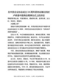 在中资企业协会成立XX周年招待会暨比利时卢森堡中国商会揭牌仪式上的讲话.doc