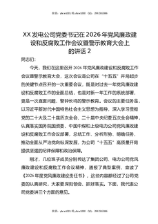 XX发电公司党委书记在2026年党风廉政建设和反腐败工作会议暨警示教育大会上的讲话2.docx