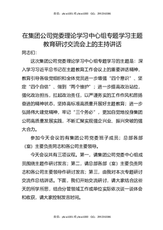 在集团公司党委理论学习中心组专题学习主题教育研讨交流会上的主持讲话.docx